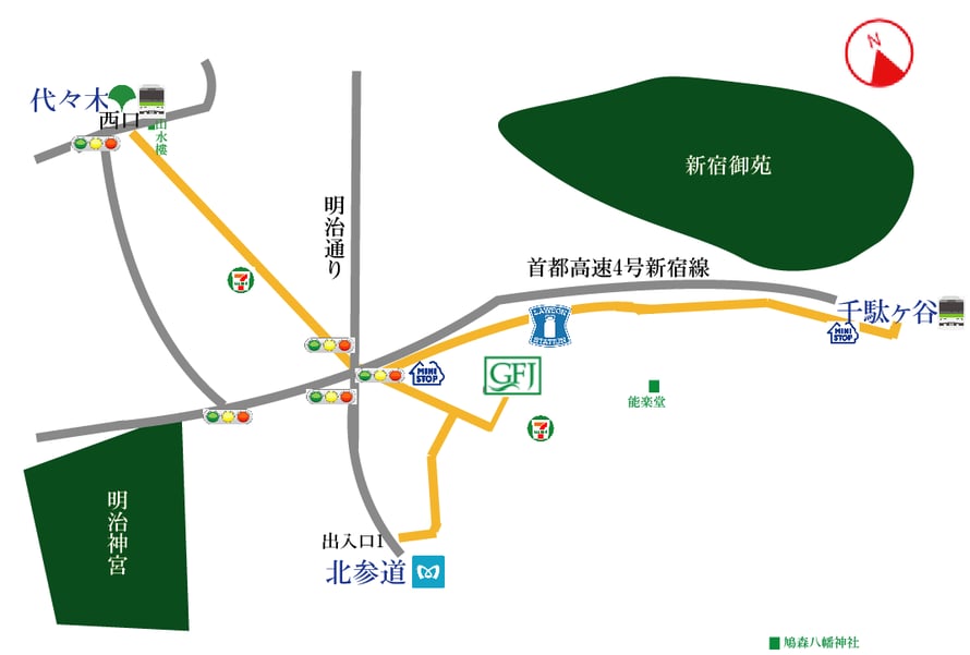 ミニストップ・大京本社右横の千駄ヶ谷大通り商店街を南に直進し約100m進むと左手に、第一勧業信用組合千駄ヶ谷支店があります。第一勧業信用組合手前の脇道を入って突き当たりのビル<神宮レジデンス>1階が当社GFJです。