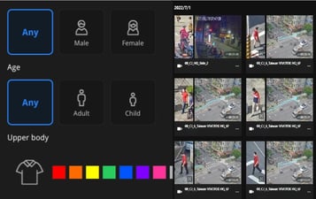 属性検索は、人物や 車両を複数の属性(例えば、性別、年齢層、服や車の色、車種など)を組み合わせて検索条件とし、該当する人物や車両を迅速かつ正確に探し出すことができます。